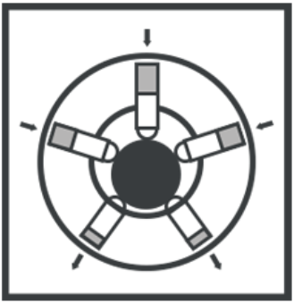 The outlet ports are semi-circular holes in the Valve Plate, which can be seen on the edge on the far right of the system and in a head-on view below, right. Half of the pistons suck in fluid as they pass over the intake port while the pump rotates. The fluid from the other pistons is discharged through the output port. The radial piston pump, swash plate pump, and wobbling pump should all be compared to this pump.
